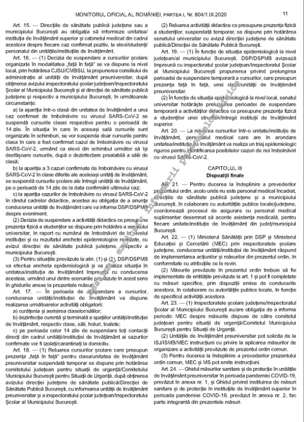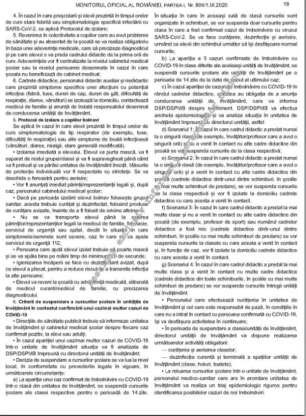 La apariția într-o clasă din unitatea de învățământ, a unui caz confirmat de îmbolnăvire cu virusul SARS-COV-2, se suspendă cursurile clasei respective, pentru o perioada de 14 zile. În situația în care în aceeași sală cursurile sunt organizate în schimburi, se vor suspenda doar cursurile pentru clasa în care a fost confirmat cazul de îmbolnăvire cu virusul SARS-CoV-2, urmând ca elevii din schimbul următor să își desfășoare cursurile.