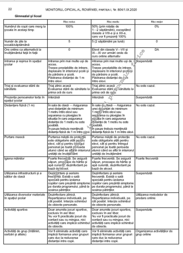 La apariția a 3 cazuri confirmate de îmbolnăvire cu virusul SARS-CoV-2 în clase diferite ale aceleiași unități de învățământ, se suspendă cursurile școlare ale întregii unității de învățământ, pe o perioada de 14 zile de la data confirmării ultimului caz;