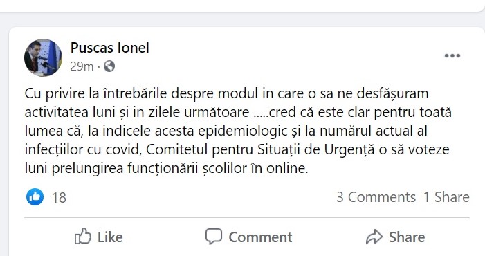 „Cu privire la întrebările despre modul in care o sa ne desfășuram activitatea luni și in zilele următoare …..cred că este clar pentru toată lumea că, la indicele acesta epidemiologic și la numărul actual al infecțiilor cu covid, Comitetul pentru Situații de Urgență o să voteze luni prelungirea funcționării școlilor în online”, a scris Ionel Pușcaș pe contul său de Facebook.