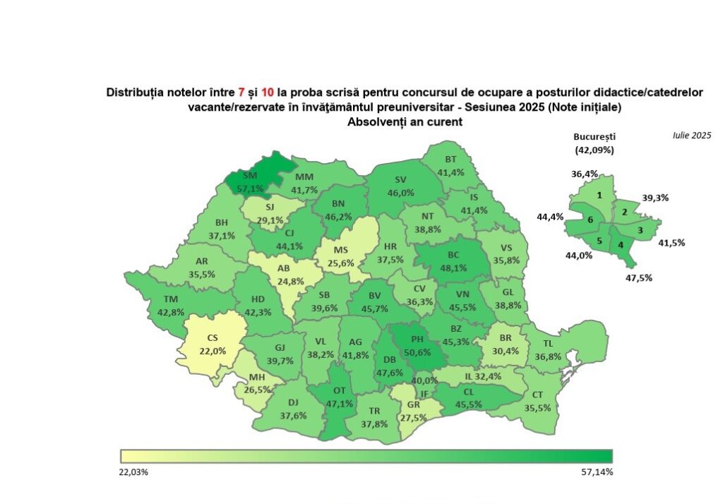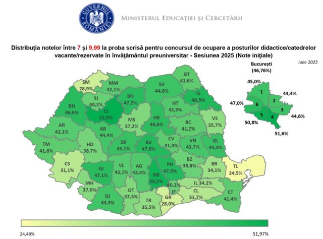 - Dintre cei 31.143 de candidaţi cu note, 13.553 de candidaţi (43,52% – 41,9% în sesiunea 2024) au obţinut note peste 7 (dintre aceştia, 41 de candidaţi au obţinut nota 10);